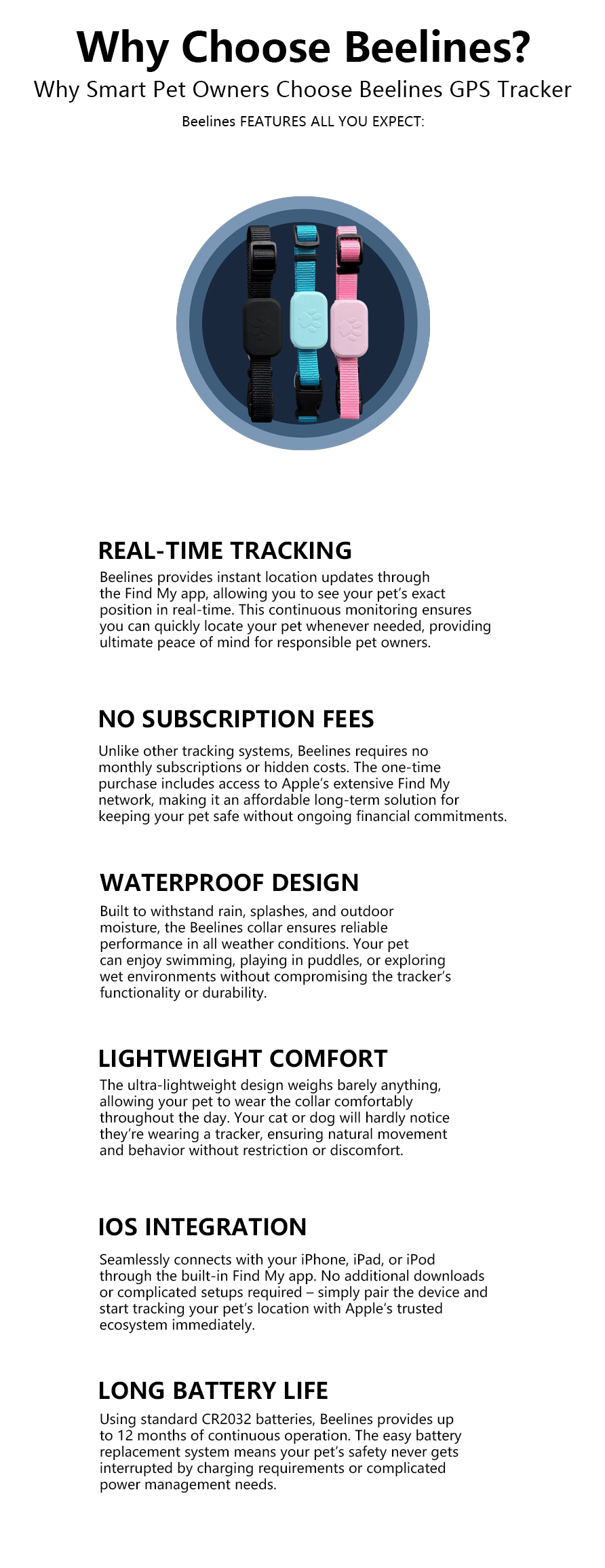 The Beelines tracker features an adjustable, lightweight collar that ensures all-day comfort for your pet. Its simple battery replacement system and easy iOS integration make pet tracking effortless and worry-free for busy pet owners.
